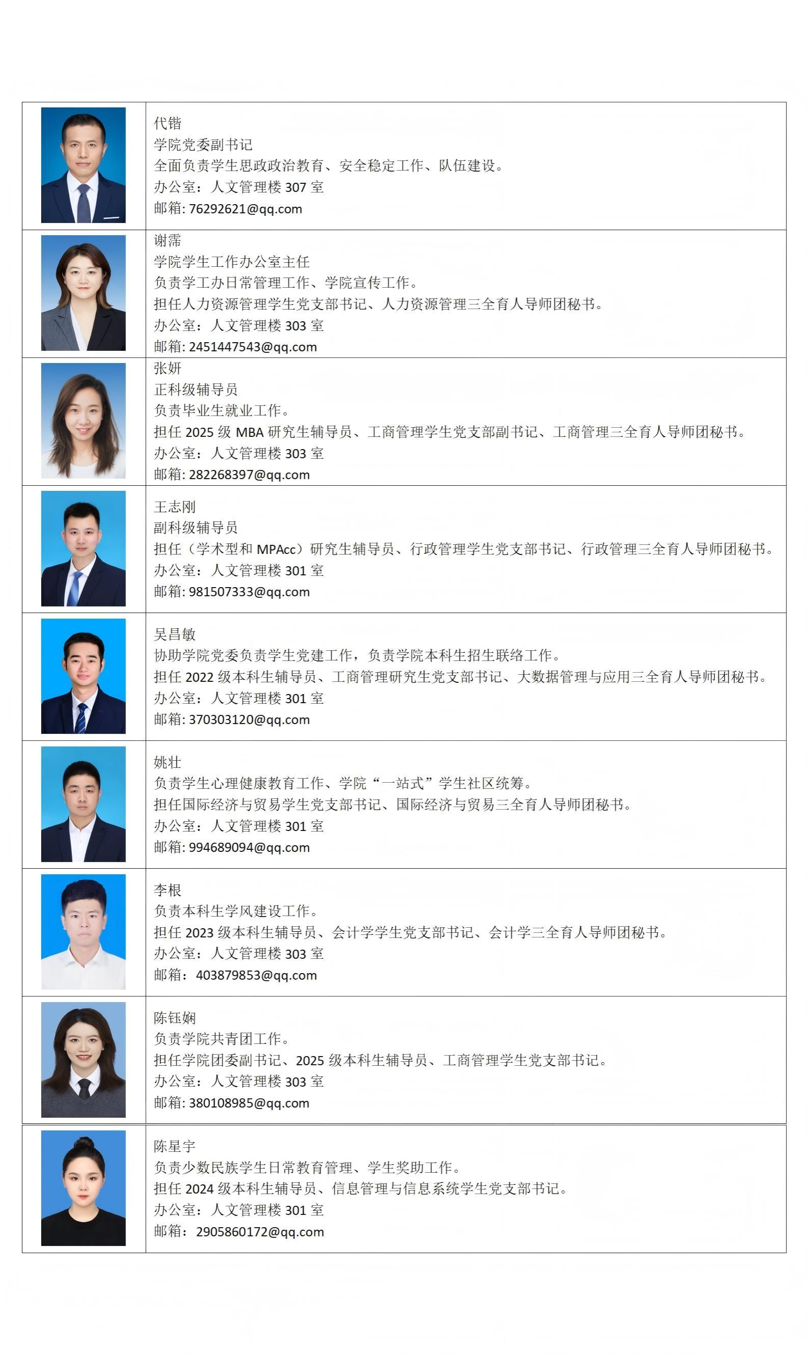 管理学院学工团队共9人,其中,学院党委副书记1人,辅导员8人,具体分工如下: