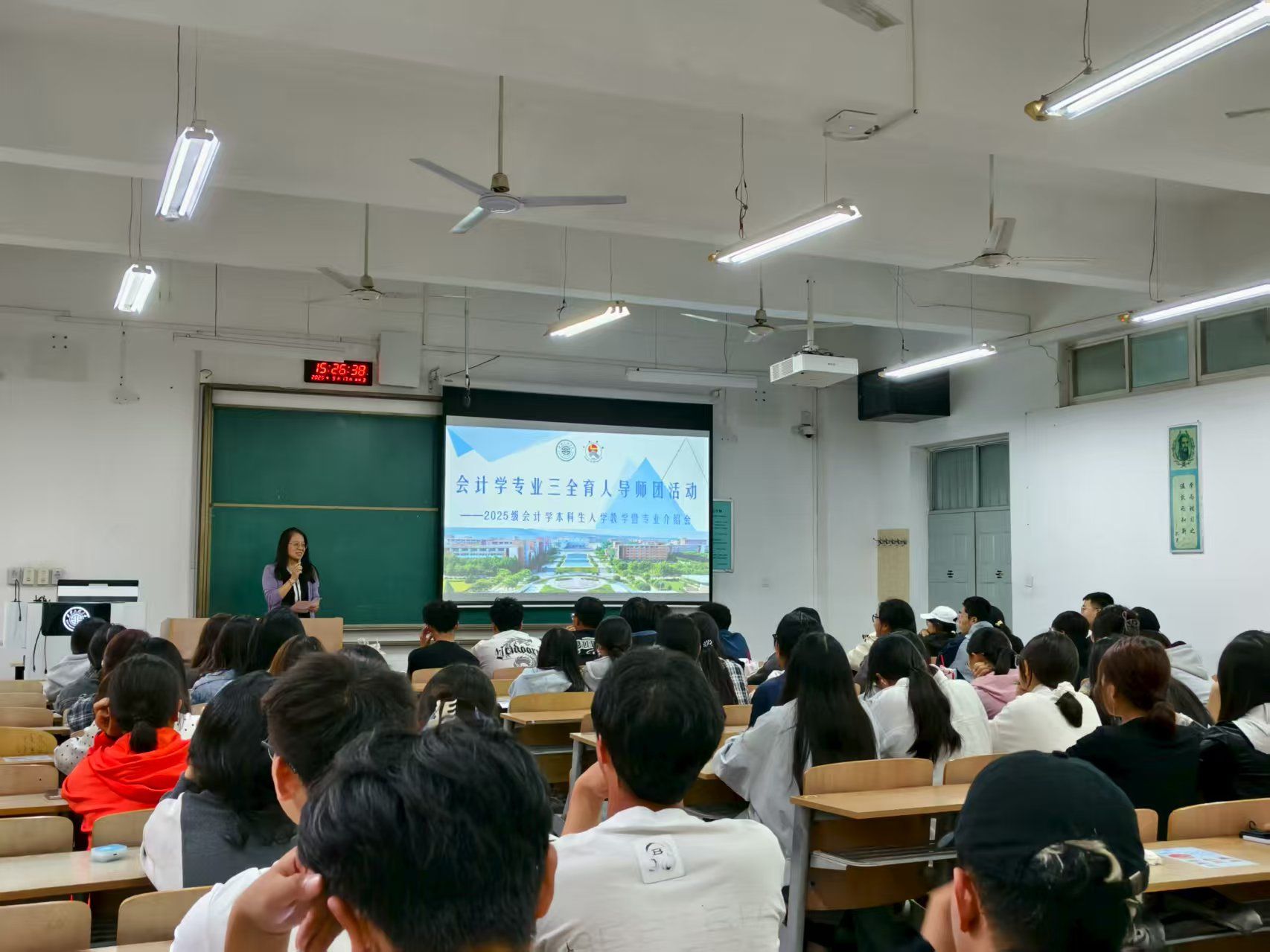 2025年9月17日下午,管理学院会计系在临潼校区教学楼A-122教室开展三全育人导师团活动暨会计学本科生入学教育与专业介绍会。会计系主任王小红教授、会计二班班主任曹铭老师及会计系25级全体学生参加本次会议,王小红老师主持。