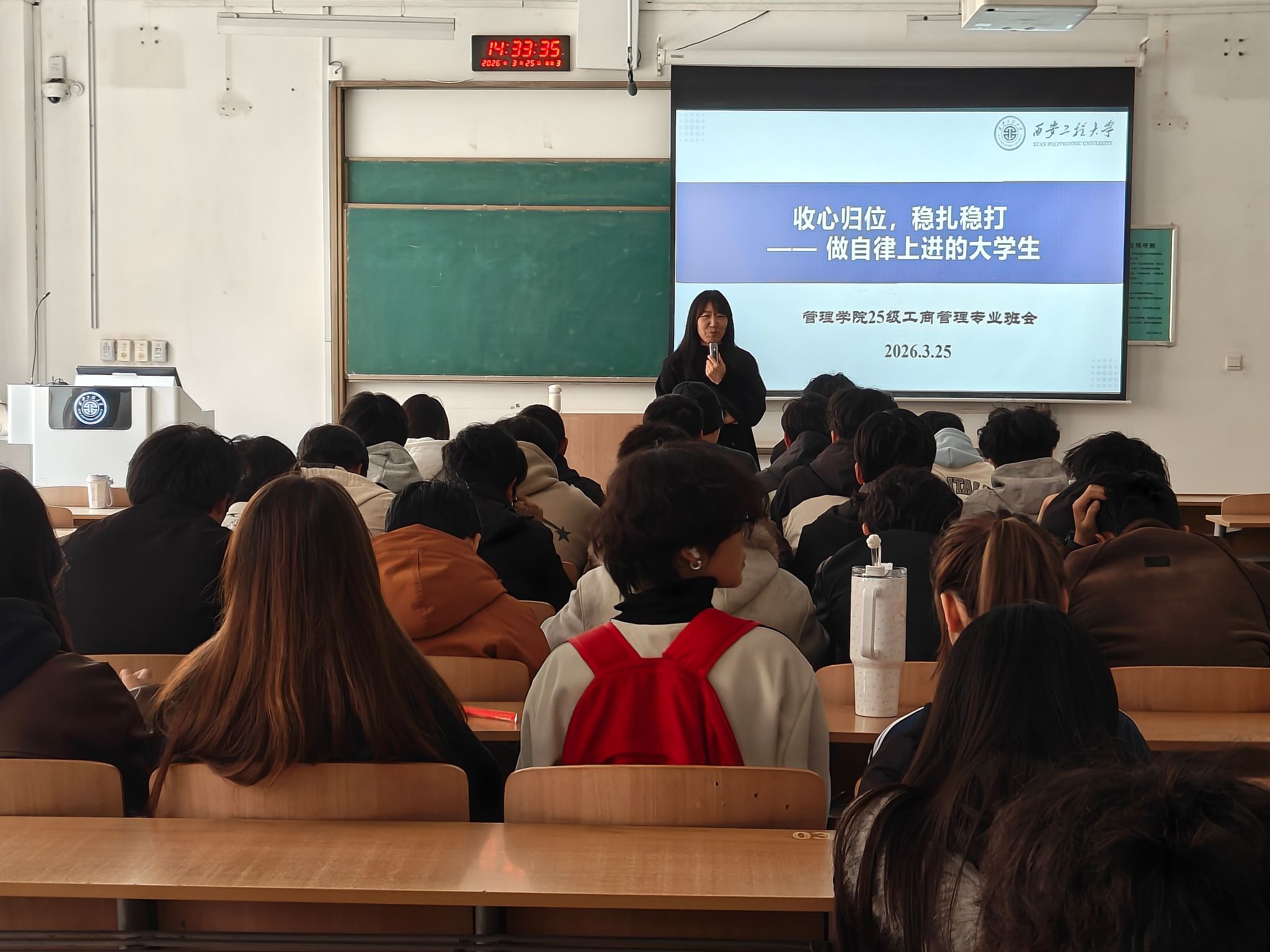 2026年3月25日,为帮助同学们明确学习目标、规范日常行为、规避学业风险,25级工商管理专业在A122教室召开“自律规划,携手共进”的主题班会。本次班会由张维月老师主持,25级工商管理全体学生参与。
