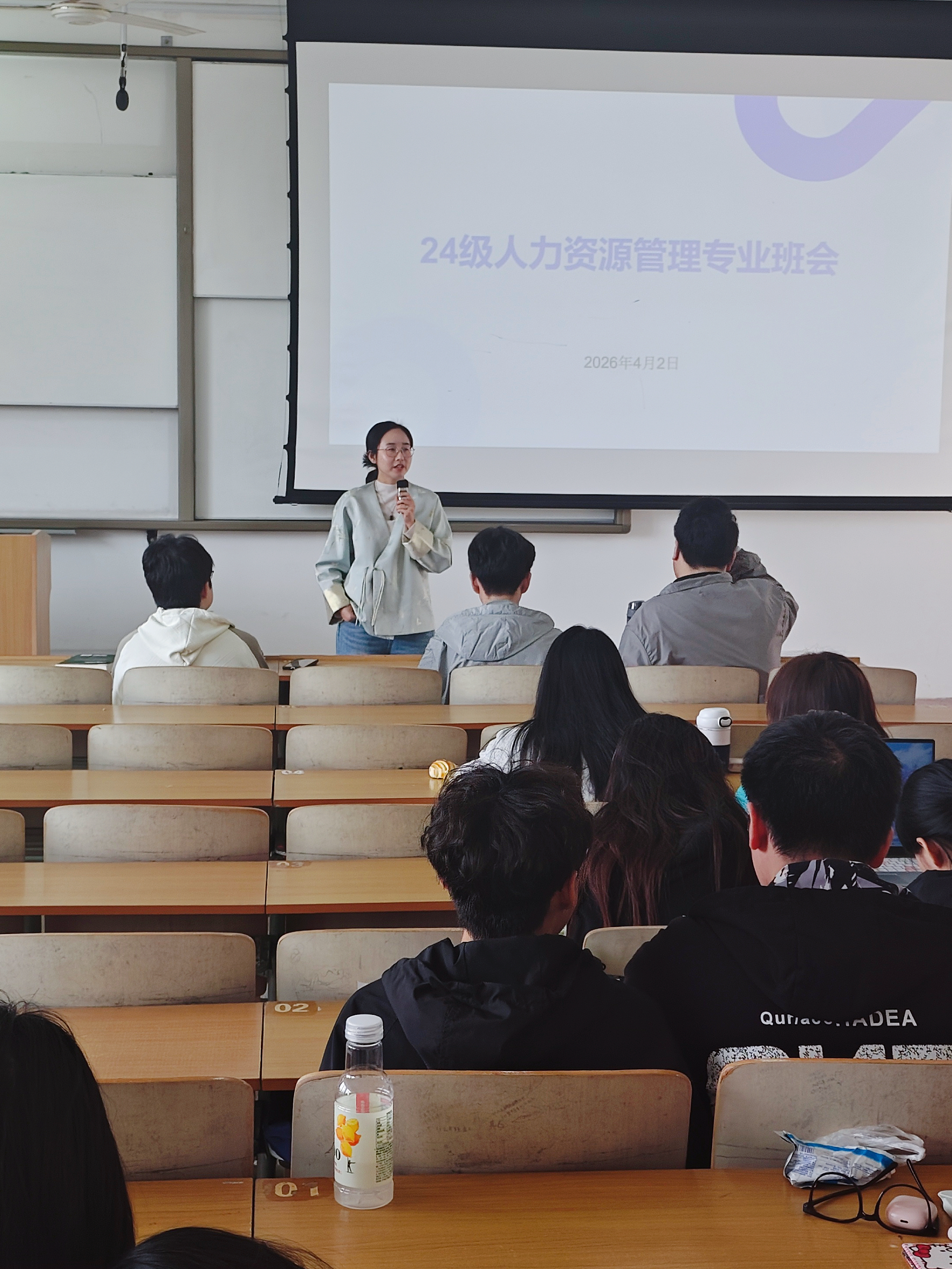 为引导大二学生树立专业自信、明晰学习方向,2026年4月2日,管理学院人力三全育人导师团在教学楼D296教室召开“看见专业的力量,锤炼做事的能力”主题班会,2024级人力资源管理专业1班、2班全体同学参加。班主任陈钰瑶老师围绕专业底气、认知升维与做事态度三个方面展开讲解。陈钰瑶指出,人力资源管理并非简单的“招人、发工资”,而是驱动企业增长的战略引擎。选人、育人、留人、用人的能力,是优秀企业的刚需,她鼓励同学们从专业课程的学习中建立认同感,认识到自己所学专业的技术价值和战略价值。