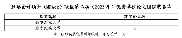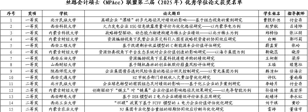 2025年9月1日,丝路会计硕士(MPAcc)联盟第二届优秀学位论文获奖名单产生。经过第一、二阶段匿名通讯评审,以及联盟论文工作委员会审议,23所联盟成员高校推荐参评论文中共评出40篇获奖论文,其中一等奖10篇,二等奖12篇,三等奖18篇。我院MPAcc学位点共推荐了6篇候选优秀学位论文,共获奖5篇,其中获一等奖1篇、二等奖2篇、三等奖2篇,同时,我校还获得第二届丝路会计硕士(MPAcc)联盟(2025年)优秀学位论文组织奖。