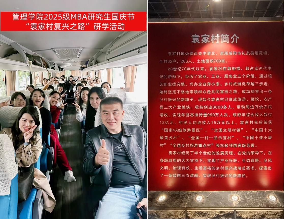 2025年10月4日,正值国庆佳节,西安工程大学管理学院2025级MBA研究生前往袁家村,开展了为期一天的“袁家村复兴之路”研学活动,王渊副院长带队出行。活动伊始,王渊作行前动员。他指出,袁家村已实现从乡村旅游到品牌与模式输出的成功转型,是极具研究价值的商业案例。百余名来自全国各地的MBA学生以移动课堂的形式,在沉浸式研学中感知乡村发展实践,于红色记忆与民俗文化交融中度过了一个富有意义的国庆假期。
