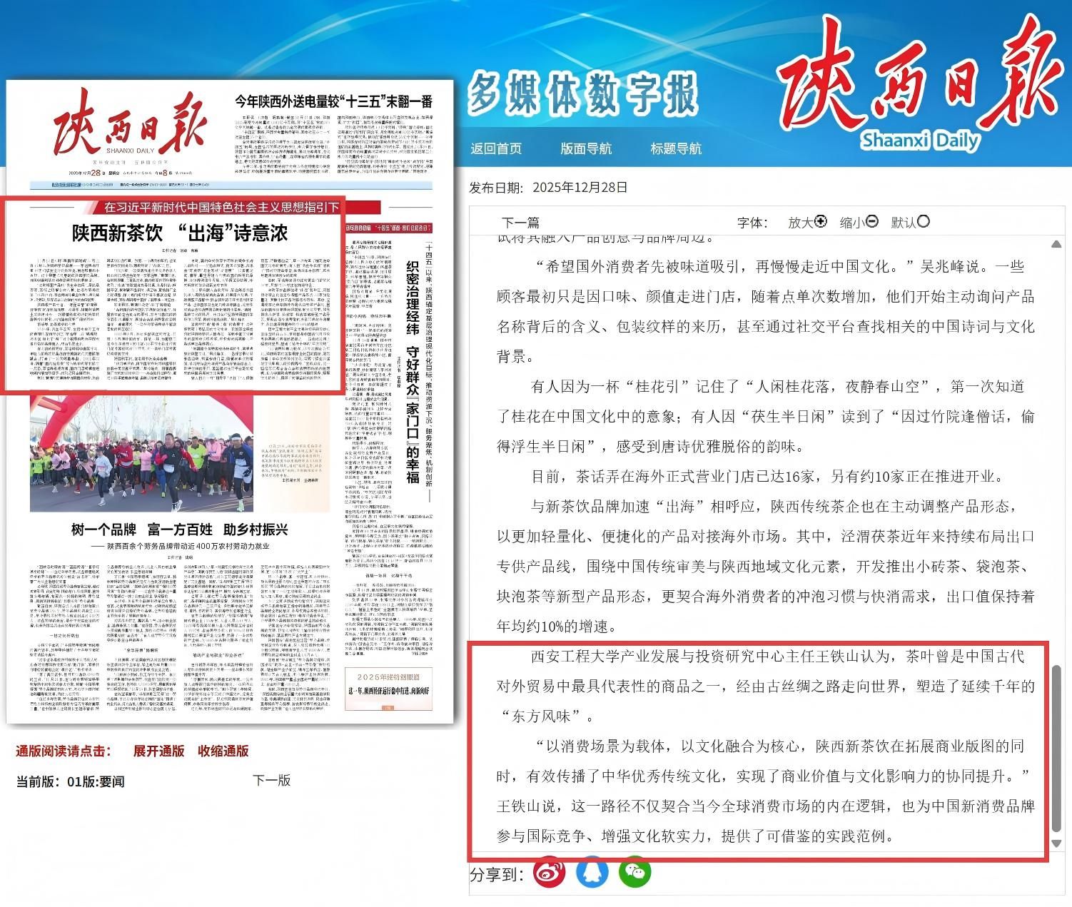 2025年12月28日,《陕西日报》头版头条以《陕西新茶饮“出海”诗意浓》为题,深度报道了陕西新茶饮品牌“茶话弄”走向欧美市场的创新实践。报道中,我院产业发展与投资研究中心主任王铁山从产业发展的专业视角,剖析了这一现象背后的逻辑与启示。他指出,茶叶作为古丝绸之路的标志性商品,曾将“东方风味”传遍世界。如今,以“茶话弄”为代表的新茶饮品牌正以现代消费场景为载体,以文化融合创新为核心,在拓展国际商业版图的同时,有效地传播着中华优秀传统文化,实现了商业价值与文化软实力的双赢。这一路径不仅精准契合了全球消费市场的新趋势,也为更多中国新消费品牌参与国际竞争、讲述中国故事提供了鲜活而深刻的实践范例。